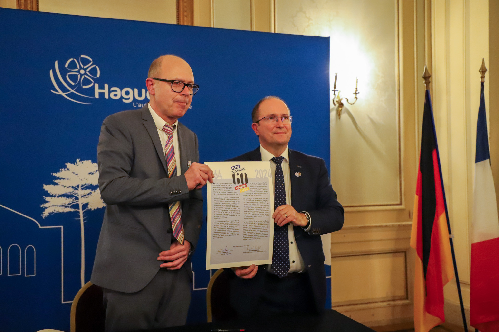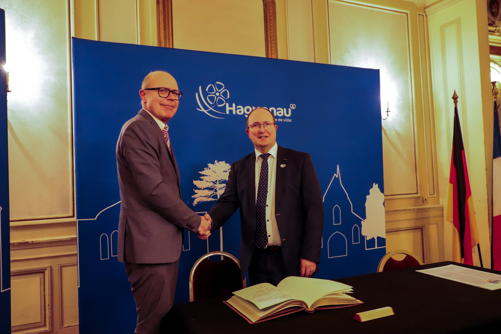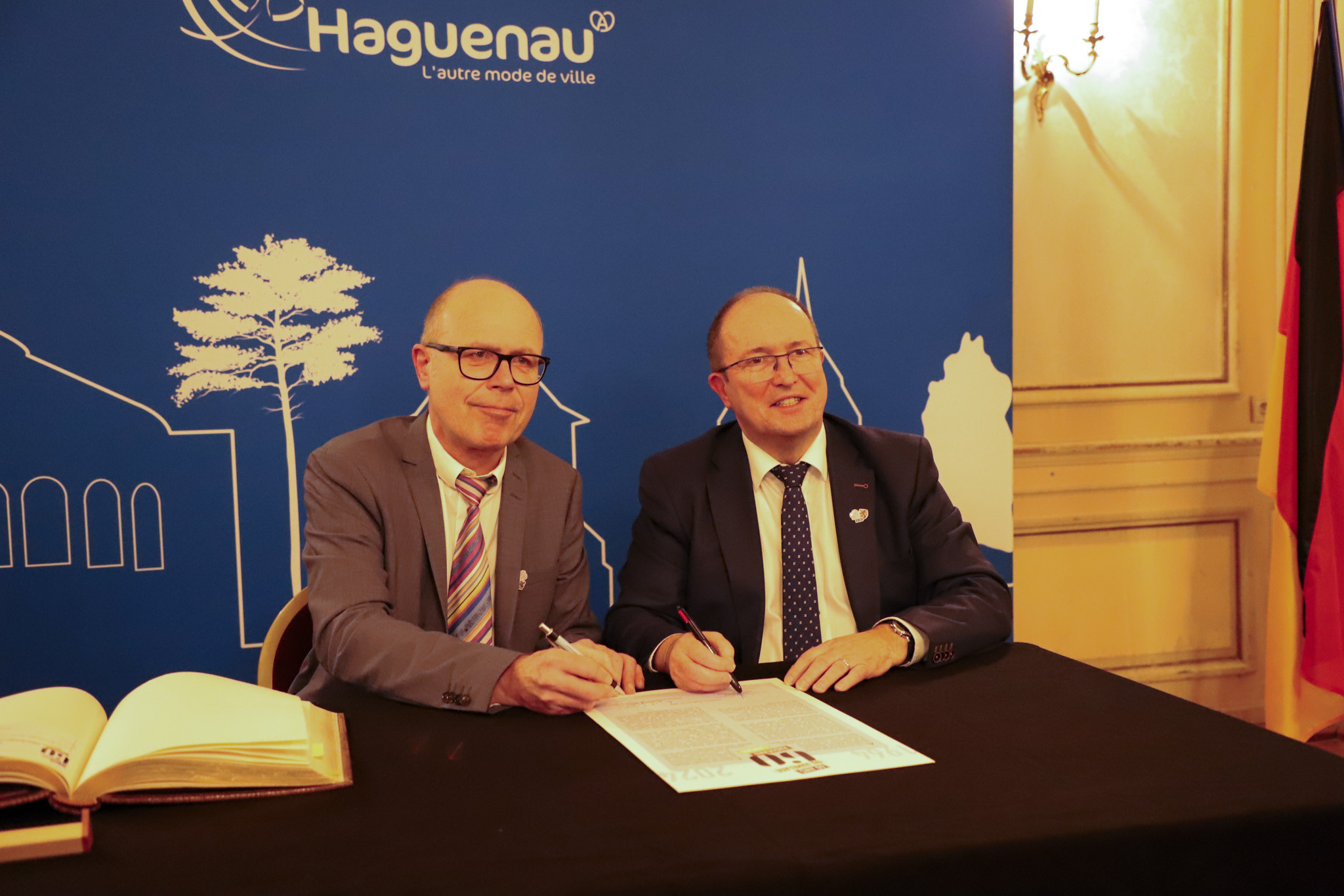Dans la salle de la Douane, au côté de l'Oberbürgermeister Dominik Geißler, le maire Claude Sturni a apposé sa signature sur la Charte de renouvellement du jumelage. Ensemble, nos deux villes font vivre, à notre échelle, l'amitié franco-allemande !